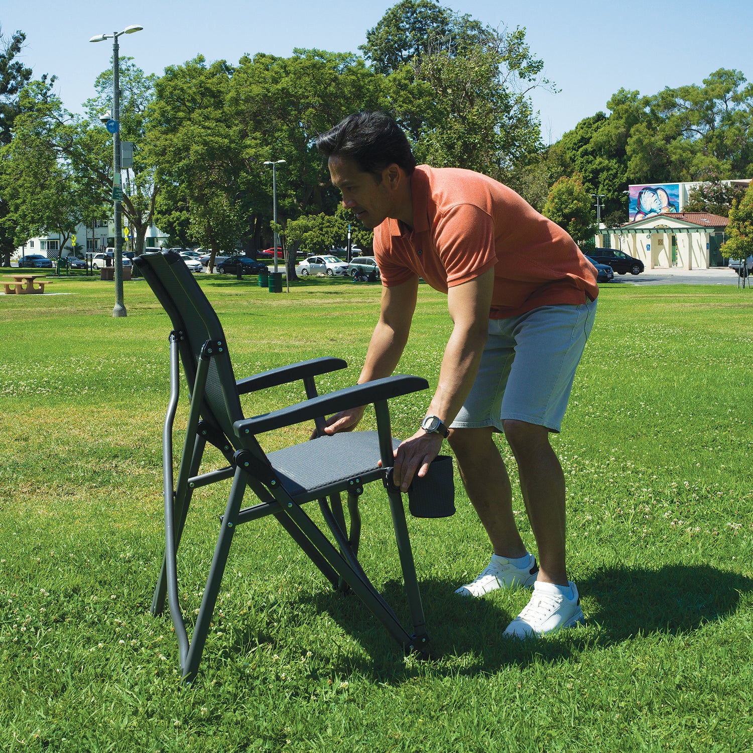 capable of being folded down to a compact size of x” by x”, this chair is perfect for convenient transport from the trunk to the field.